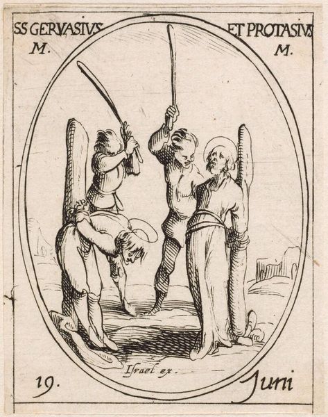 Curator: This is Jacques Callot's "Saint Urban," a small yet powerful etching. The composition is immediately striking—a figure being scourged dominates the center. Editor: My eye is drawn to that halo; it's so delicate against the brutality of the scene. And that small crown resting near Urban's feet—what does that represent? Curator: That’s likely a papal tiara, connecting the Saint to his role as Pope. The scourging is meant to convey his martyrdom, reflecting a broader history of persecution against religious figures and communities. Editor: Indeed, the implements of torture, and even the dress of the tormentors, feel rooted in historical narratives of dominance and control. It's a stark reminder of power dynamics. Curator: Callot’s work prompts a deep meditation on how power operates through violence. Editor: It certainly leaves you contemplating the enduring presence of these themes throughout history.
