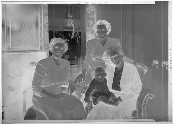 Editor: This is an intriguing image, a family portrait with six generations by Harry Annas. It's a photographic negative, which gives it this ghostly, ethereal quality. What strikes me is how it captures the weight of time, a lineage stretching back. What do you make of it? Curator: It whispers of ancestral echoes, doesn’t it? Look at the formality, the stiff poses, yet the tenderness in the woman holding the baby. It’s like peering into a dream, a collective memory. Does the reversal make you feel like you are seeing the other side of life? Editor: It does. It's like a secret unveiled, a hidden history coming to light. Curator: Exactly! And that’s the beauty of it, isn’t it? It makes us question what we think we know about family, about history, about ourselves.