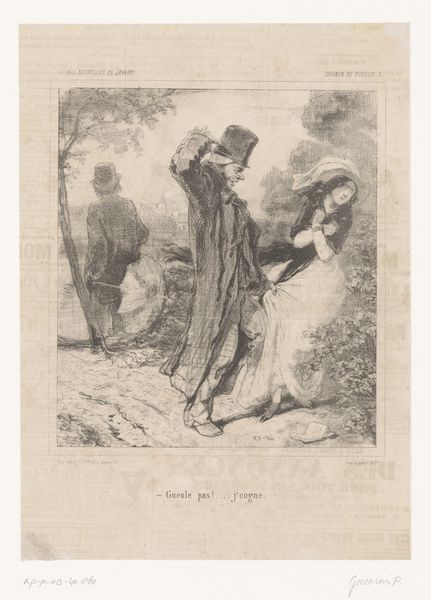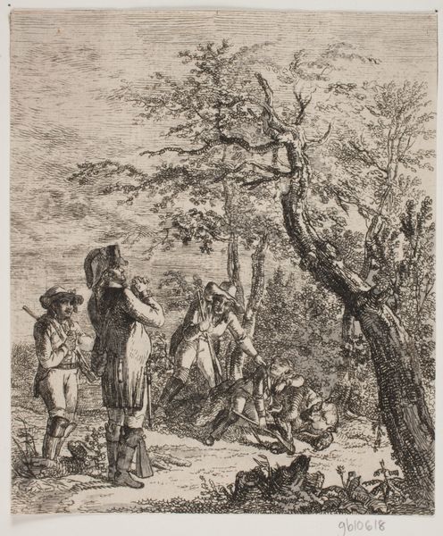 Editor: So this is "Hagenpreek van de Hugenoten", or "Field Sermon of the Huguenots," from 1850. It's a print by Charles Billoin, and the museum's listed the medium as etching. It’s got this clandestine, almost fearful mood about it, seeing this group gathered in secret. How do you interpret this work, especially given its historical context and the material choices Billoin made? Curator: Considering it’s an etching, the relative ease of production allowed for wider circulation of this imagery. Etchings like these, reproduced in multiple editions, acted as a form of visual propaganda, embedding and shaping ideas about religious identity and oppression for mass consumption. What social and political climate would lead Billoin to recreate the scene of this forbidden Protestant gathering from centuries past? Editor: That's fascinating – visual propaganda, distributed so widely! Given it’s dated 1850, a period of revolution across Europe, it's easy to imagine people then identified with the Huguenots fight against religious oppression and state power. But why use this particular historical episode, rather than depicting say contemporary events, considering those dangers may still be relevant in the artist's current context? Curator: Perhaps, by locating the event in the past, he avoids direct censorship, yet the work speaks to the continuous struggles faced by those challenging authority. And notice how the landscape itself acts as a kind of raw material – the ground provides shelter for the sermon, emphasizing the groundedness of religious feeling but also the precarity of dissent. Do you agree that this depiction helps transform everyday acts into a political statement? Editor: I do! Framing it as part of this ongoing struggle makes it feel less like a specific historical event and more like a universal experience of resistance. Thanks, this perspective makes so much sense. Curator: It’s interesting to see how revisiting past techniques such as etching helps engage the audience with materials charged with history, and makes that resistance tangible.