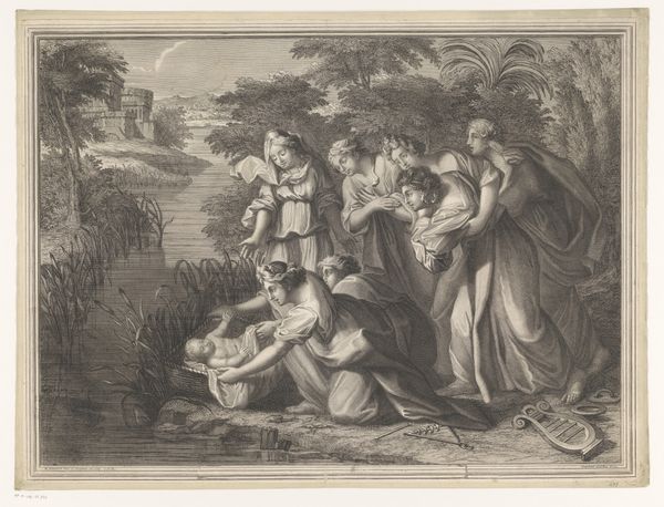 Angelica Kauffmann created this drawing of Servius Tullius using pen and brown ink with gray wash on paper. The limited tonal range lends the image a dreamlike quality, fitting for a scene of hushed observation. The artist’s hand is evident in the confident strokes of the pen, which define the figures and their garments. Light and shadow are delicately rendered with the gray wash, creating a sense of depth and volume. Note the drapery, and the careful arrangement of the figures around the child. Kauffmann, a leading history painter, draws from a well-established visual vocabulary. Here, the fluid strokes of her pen articulate forms that echo classical statuary, with careful attention to the play of light and shadow. The scene’s stillness evokes a tableau vivant, a theatrical form popular in the 18th century, underscoring the performative nature of power and privilege depicted. The drawing’s power resides in the dynamic between the artist’s skilled hand and the rich cultural context that her drawing evokes, blurring lines between craft, fine art, and social commentary.