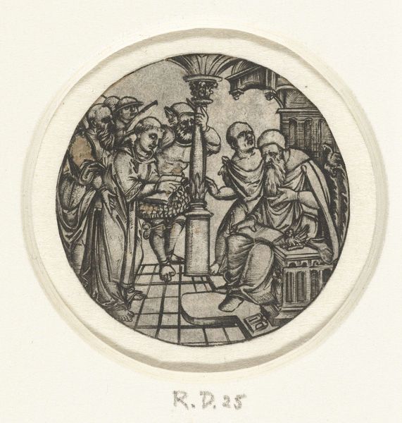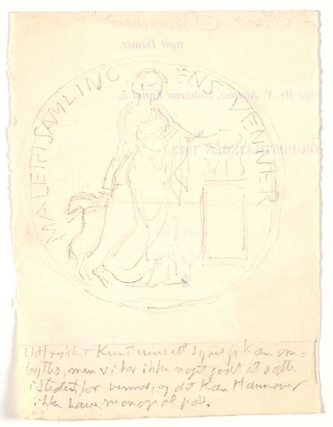 Joakim Skovgaard made this decorative sketch of two seated figures, a 'tondo', using graphite on paper. The lines, rendered with deliberate simplicity, give form to the two figures. The round shape of the design echoes the medieval tradition, where such drawings often served as preliminary studies for larger artworks, like stained glass windows. Consider the choice of graphite: It's a medium that allows for easy erasure and revision, perfectly suited to the exploratory nature of a sketch. You can almost see Skovgaard working out his ideas, testing different compositions, and refining his vision. In the context of Skovgaard's larger body of work, this drawing is a reminder that all art, no matter how grand, begins with the humble act of putting pencil to paper. This work blurs the line between the preparatory sketch and the finished artwork, inviting us to appreciate the beauty and skill inherent in the act of creation itself.