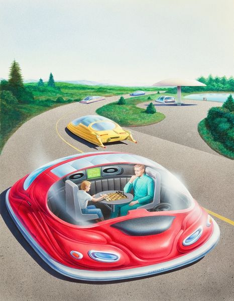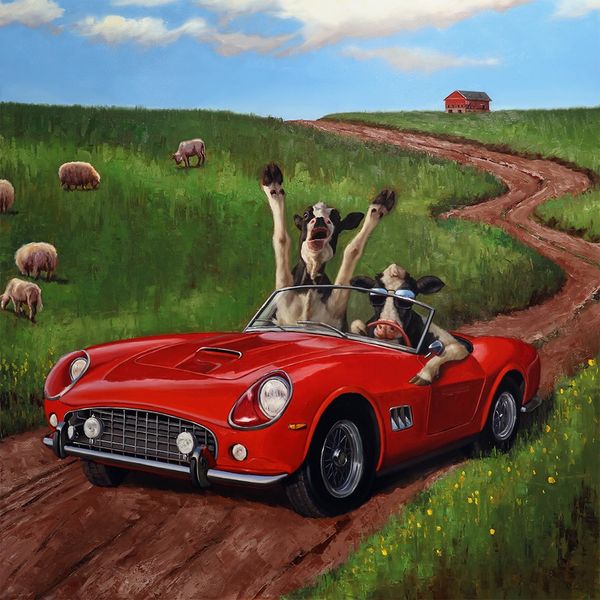 Editor: This is "Country Drive" by Lucia Heffernan, a contemporary acrylic painting featuring impasto and plein-air techniques. It strikes me as a playful take on leisure, but also feels… pointed. How do you interpret this work? Curator: The work indeed presents an immediate sense of whimsy. However, consider the underlying narratives around status and access. The red convertible, the landscape, the carefully rendered animal caricatures, these become potent symbols. Where do you think Heffernan situates herself in relation to these themes? Editor: I guess I hadn't thought of it that way. I was mostly amused by the animals in the car. But, are you saying there is something more subversive at play? That the painting critiques something about class? Curator: It's possible. The artist juxtaposes these anthropomorphic figures with markers of wealth and leisure. Think about who historically has access to these kinds of luxuries. Consider the potential for a satirical reading of "country drives" and the values they represent, through the lens of intersectionality and social critique. What statements might Heffernan be making? Editor: Maybe about who gets to enjoy that "freedom of the road"? And, the...confidence to "take up space", so to speak. It reframes that image completely, adding layers of commentary I initially missed. Curator: Precisely! Art has the power to simultaneously entertain and provoke critical reflection. It’s a visual invitation to dismantle prevailing social narratives and re-evaluate entrenched value systems. Editor: I'm beginning to appreciate the artwork on a deeper level. What appeared purely lighthearted reveals deeper societal undercurrents when viewed through a critical lens. Curator: Indeed. The beauty of art lies in its capacity to challenge and transform our perspectives.
