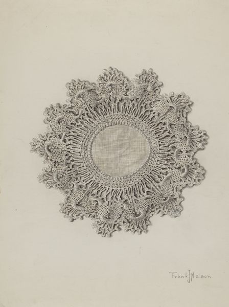Curator: Lena Nastasi created this pen-and-ink drawing, “Needlework,” around 1936. Editor: My initial reaction is of a very deliberate, almost obsessive, pattern-making. There’s a handmade, craft-like quality that feels both intricate and perhaps a bit unsettling. Curator: Unsettling? I find it rather captivating, considering the socio-political landscape of the time. To me, this recalls a subversive reclamation of traditionally feminized crafts like sewing or embroidery. In that era, creating detailed handiwork offered women a limited sanctioned creative outlet. Nastasi seems to acknowledge that restriction, perhaps reinterpreting "craft" within more liberated aesthetic boundaries. Editor: Yes, but observe how she replicates circular motifs and repeated stitches. Circular mandalas historically often function as emblems for cosmic unity or divine energies, reflecting harmony or completion. The laboriousness inherent to "needlework" becomes an almost meditative act here. Does this offer Nastasi psychological refuge amidst greater upheaval? Curator: It’s also interesting to consider class. Access to formal artistic training may have been limited based on social standing; thus, traditional crafts became viable creative means for some women despite systemic constraints placed upon gender and socio-economic mobility during that period. Editor: Good point. Now notice how even its seemingly basic structure invokes floral and plant-like designs rendered entirely by thread-like strokes with the fineness suggesting painstaking attentiveness; the whole presents themes associated often feminine domains alongside concepts surrounding life’s generative forces! I suspect there are profound layers being unveiled within its ostensibly simple form. Curator: Indeed. I wonder how her choice to render such traditionally “feminine” techniques challenges prevailing perceptions concerning high and low art? Was it intentional rebellion, quiet resistance, or even a method to circumvent obstacles preventing female artistic agency then. Her biography would illuminate that considerably... Editor: Regardless her intent, her composition conveys themes still incredibly relevant; we discover intricate emotional and symbolic resonance amidst carefully stitched, or rather, sketched patterns mirroring societal textiles past through lens illuminating identity construction from multiple cultural positions too today! Curator: A fruitful reflection – artistic strategies of quiet resistance woven carefully within familiar frameworks, a dialogue echoing throughout time. Editor: It invites closer introspection on recurring symbolism – enduring seeds within what simply looked domestic now made visibly loud!