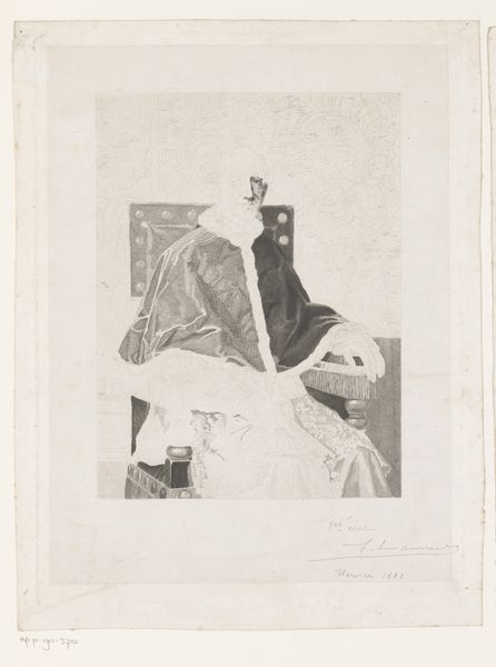 Curator: What strikes me first is the tonal range; it’s muted but creates a really contemplative atmosphere. Almost dreamlike. Editor: Absolutely. This photograph, titled “Fotoreproductie van een schilderij van drie vrouwen tijdens een gesprek in een tuin door Alfred Stevens” pre-dates 1863. It's an interesting example of photography being used to document and disseminate painted images, essentially a reproductive print of a genre painting. It showcases the visual culture of the mid-19th century. Curator: Right, but if we strip away the title for a moment, we're still left with this potent scene of women together. Note the deliberate contrast between the woman dressed in light colors and the other one in black; the differences and relationships could suggest all kinds of gendered power dynamics. Perhaps even a conversation about their societal roles. Editor: The photograph’s cultural impact lies, in part, in its accessibility. Imagine this circulating amongst middle-class households, presenting a particular vision of femininity and domesticity. Consider who was included and who was systematically excluded. Curator: Precisely. Think about the garden setting, a common motif of leisure for privileged women. The inclusion of a seemingly relaxed dog on the floor adds a subtle, but telling, layer of the unbothered attitude towards the societal challenges outside the space. It could almost serve as a commentary on class and privilege. Editor: I'd like to point out how it fits into a wider history. Photography itself was undergoing rapid development at this time, influencing visual art. We can trace its impact through shifts in Impressionism, for example. But these representations in this artwork were not often about true social change. Instead, they mostly just reproduced prevailing norms. Curator: Fair point. Despite its apparent stillness, the photograph opens a window onto ongoing power structures. There are the gazes and gestures, the contrasts and proximities. They silently perform gendered codes. Editor: Thinking about the museum context then, it encourages us to understand what historical conversations informed it and how photography altered art viewing more broadly. Curator: Ultimately, it's a photograph holding layers that reflect upon society itself. Editor: It truly is more than just an aesthetic piece; it's a reflection of social currents captured in light and shadow.