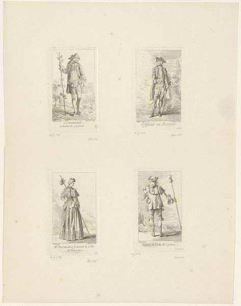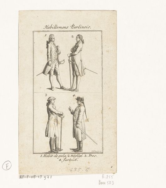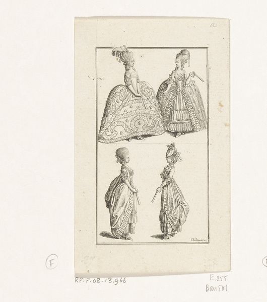 Curator: Here we have Daniel Nikolaus Chodowiecki’s print, “Kleding voor dames,” from 1781, residing here at the Rijksmuseum. Editor: Well, my immediate reaction is the exquisite detail considering it is only an engraving! I notice the fine lines in the fabrics and the intricate hairstyles – almost seems like lace crafted from metal. Curator: Absolutely, and the very title "Clothing for Ladies" immediately raises questions. Who were these images for? Consider the rising middle class and their increasing consumption of fashion as a marker of social status. Editor: It's interesting you say that. I'm wondering about the printing process itself – the copper plate, the labor involved, how these images were distributed and consumed. Were these luxury items themselves, or were they mass-produced to disseminate these styles broadly? The social life of engravings as carriers of cultural codes. Curator: Exactly! This image speaks to the power of the Rococo style in late 18th-century Europe. A clear desire to display the elegance that courtly fashion imposed on the body and life of upper-class women. Also, look how women were perceived; they're displayed for public consumption. Editor: And not just displayed but codified – each outfit even comes with its function; whether walking or riding a horse! Think about the layers of craftwork within that singular hat and what material, labor and global economy makes its appearance possible. It opens a world, a world that speaks to both women and makers of objects. Curator: It does! But to circle back to Chodowiecki’s role within this system. As an artist, his style reflects the social currents of the time but how much was he consciously aware and commenting on it, versus simply reflecting the aesthetic norms of his environment. Editor: That is what makes this such a compelling document. It's beautiful. To study art with a knowledge of how materials circulate helps you see the social context of making as deeply embedded in an artwork. Curator: Precisely. Examining "Clothing for Ladies" we not only glimpse a world of fashion, but a complex network of production, distribution, and societal values reflected and reinforced through images.