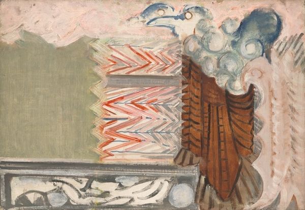 Editor: This painting, "Untitled" by Mark Rothko, from around 1940-1941, is rendered in oil paint. It's definitely evocative – the ghostly figures seem caught between dreams and nightmares. What are your initial thoughts on how he’s constructed meaning here? Curator: Given this work's socio-political environment and the material application, it speaks volumes about the precarity of identity in wartime. Look at the textures. The quick, almost frantic, application of oil paint suggests a rushed, urgent creation. How does this visible labor contribute to the meaning, beyond the subject matter itself? Editor: I see what you mean about the labor; it's not just *what* he paints, but *how*. It does feel raw. Curator: Exactly. Rothko’s choices of figuration and surrealism are significant departures for him. Why do you think an artist typically known for abstract expressionism might adopt this style earlier in his career? Think about access, material availability, and audience expectations at the time. Editor: Maybe it was a more direct way to engage with the anxieties of the time? Abstraction hadn’t yet become the dominant mode, so maybe the choice of material reflects those historical contingencies? Curator: Precisely. And notice how the canvas itself seems to dictate the form, rather than the other way around. It highlights a resistance to traditional academic painting standards. What societal critiques do you think the embrace of such materials might have implied during that era? Editor: I never considered the social context shaping something as simple as applying paint. So the “how” is just as important as the "what," and speaks of social and political pressures. Curator: Absolutely, analyzing the material application, like his distinct textures and figuration choices in this pre-abstract expressionist phase, really sheds light on Rothko's artistic evolution.