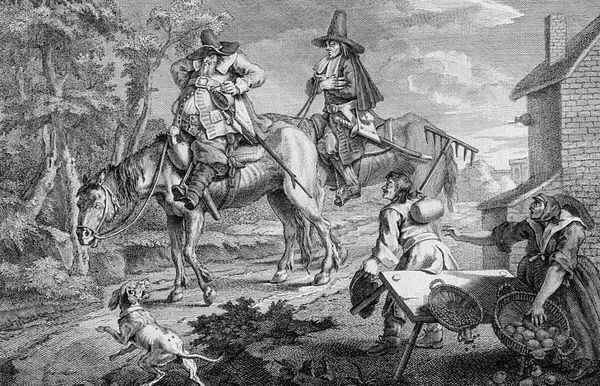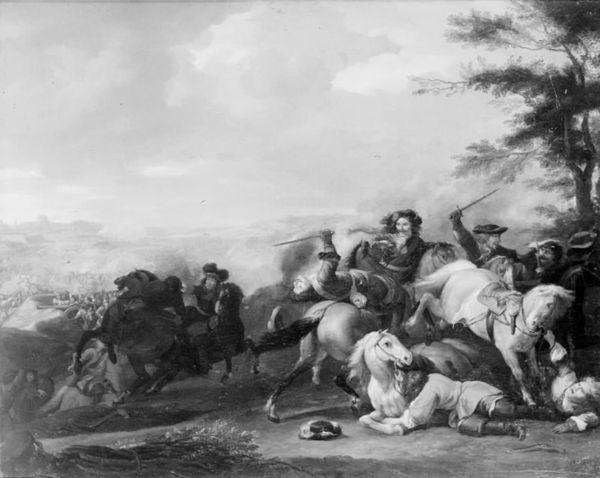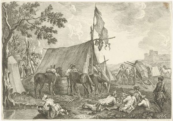 Johann Heinrich Roos painted 'A Camp,' an undated artwork, with oil on canvas. The composition is structured around a central gathering of figures, framed by the natural landscape on one side and a makeshift camp on the other. Roos employs a dynamic interplay of light and shadow to guide the viewer's eye through the scene. This is achieved through the use of chiaroscuro, which not only adds depth but also enlivens the textural contrast between the rough, earthy elements of the camp and the smoother textures of the figures' garments. Semiotically, the camp signifies a temporary settlement, a break from societal norms. In contrast, the fashionably dressed figures represent the order and hierarchy of settled society. Roos challenges the traditional landscape by integrating it with genre painting. The artwork functions as a space for cultural interpretation, blurring the lines between social commentary and aesthetic representation.