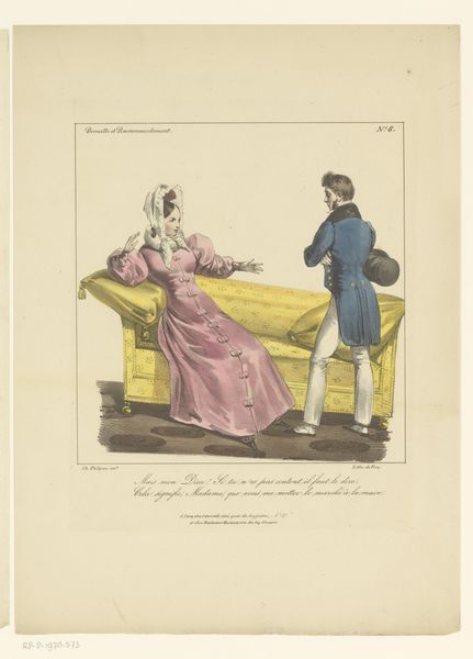 This print at the Rijksmuseum was made by Charles Philipon. The scene captivates with its contrasting figures and subtle color palette. The composition pivots around the interaction between two figures. A seated woman in a yellow dress and elaborate hat is confronted by a man in a blue coat. Note the way Philipon uses line and gesture to convey the tension between them; the man’s pointing finger and forward lean versus the woman’s raised hand and averted gaze. Structurally, the print reveals a commentary on social dynamics. The semiotics of dress—the woman’s opulent attire versus the man’s more restrained suit—hint at societal roles and expectations. The setting is sparse, focusing attention on the figures and their interaction, highlighting a moment of confrontation or negotiation. Through formal elements, Philipon crafts a narrative about power, gender, and social mores. The work invites us to decode its visual language and consider its reflections on 19th-century life.