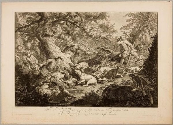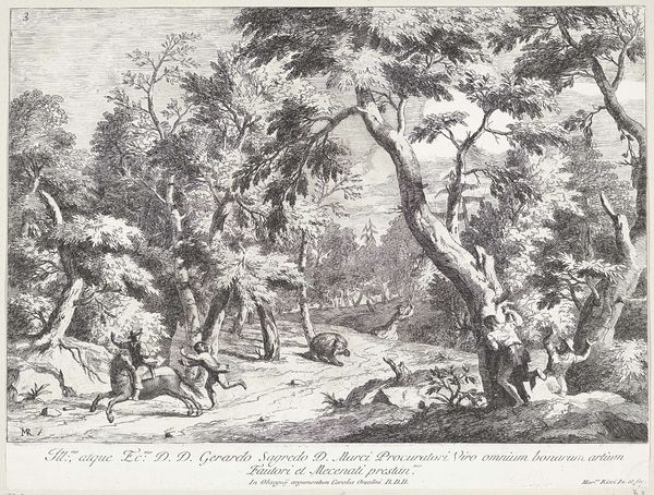 Curator: This etching by Marco Ricci, titled "Travellers in a Wood Frightened by a Bear," immediately strikes me as a study in panic. Editor: The frantic energy is palpable. What can you tell me about the means of production? Curator: Ricci's technique involves meticulous use of the etching needle on a metal plate, allowing for intricate lines and shading. The process itself reflects 18th-century printmaking practices and the economy of image distribution. Editor: Considering the context of elite patronage, it begs the question of who these "travellers" might be and what fears they represent within the societal landscape of the time. Is this a commentary on class? Curator: I see it more as an exploration of the material realities that shape artistic expression and the societal conditions that influence its production. Editor: Yet these elements all intertwine, offering diverse readings depending on your perspective. Curator: Indeed. Every viewing becomes a new layering of interpretations. Editor: It makes me wonder about the power dynamics at play, then and now.