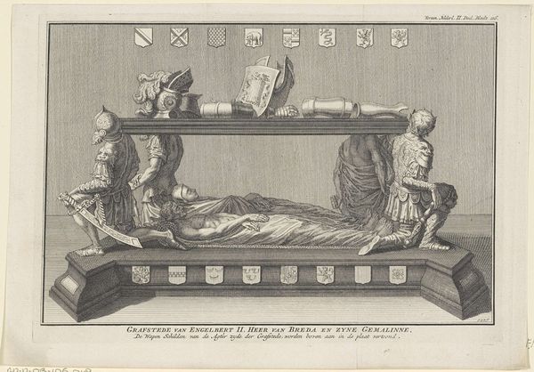 Curator: Here we have Theodor Matham's 1660 engraving, "Praalbed van Joannes Banning Wuytiers," currently held at the Rijksmuseum. What's your initial reaction? Editor: An overwhelming sense of solemnity. The stark black and white, the carefully arranged scene… it’s clearly meant to evoke a weighty, almost theatrical grief. Curator: It’s fascinating how the artist uses the medium of engraving here. Look at the fine, precise lines—they create such a controlled, detailed depiction of textures. The cloth, the wood grain, even the subtle shading of the skin, speaks volumes about the printing process and what that says about images in the baroque period, right? It's interesting that he made an print; who was this for, how did this medium affect dissemination? Editor: Absolutely, and within that meticulous detail lies a powerful symbolic language. Observe the candles, the crucifix. These aren't merely decorative; they're potent signifiers of faith, sacrifice, and the passage from earthly existence. Curator: Right. The placement of the objects is key. We have the corporeal reality of the body on this elaborate bier in juxtaposition to the celestial vision emerging at the top right with an angel's trumpet; together they are designed to highlight the transition of physical goods and wealth to divine promise, all through meticulous etching and carefully planned plate construction. Editor: And there is this focus on Joannes himself and that very personal feeling evoked through such specific choices: the inscription, the prayer hands… The intention isn’t just about a generic representation of death but also a very intimate remembrance of a specific man and his spiritual beliefs. He isn’t shown in anguish but in serene acceptance of his fate and destiny, very clearly meant to reflect the influence of his belief system at the time. Curator: It almost feels like a carefully orchestrated performance, presented to a specific set of contemporaries, highlighting not only their own values but how they choose to manifest it in print for mass distribution. Editor: I agree. There is almost a curated element that attempts to display something simultaneously human and symbolic to its contemporaries. A permanent declaration of life and of loss. Curator: So, we go from observing craftsmanship to unraveling a carefully crafted story of loss. Interesting how this all ties together. Editor: Precisely; a union of form and layered meaning that speaks across centuries.