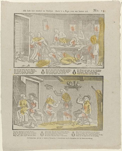 This woodcut, "Verhalen uit het Oude en het Nieuwe Testament" by Hans Brosamer, presents four narrative scenes within a single, unified frame. The compositional arrangement immediately draws us into a comparative reading of the images. Each scene, defined by its own internal logic and perspective, uses line and form to create a tapestry of human action and religious symbolism. The architectural and natural elements are rendered with precision, yet the figures, with their pronounced gestures, dominate the narrative. Brosamer employs color sparingly, strategically highlighting certain figures and objects, thus drawing attention to their symbolic importance. The scenes create a dialogue between the temporal and the spiritual realms, inviting us to decode the relationships and meanings embedded within. Note the use of framing in each scene, where architecture and landscape serve as both setting and symbolic boundary. This technique functions to isolate and elevate each narrative, while contributing to the overall semiotic structure of the work. Through its formal arrangements, this print explores the relationship between text, image, and belief in Reformation-era Europe, reminding us that art often serves as a site of cultural negotiation and exchange.