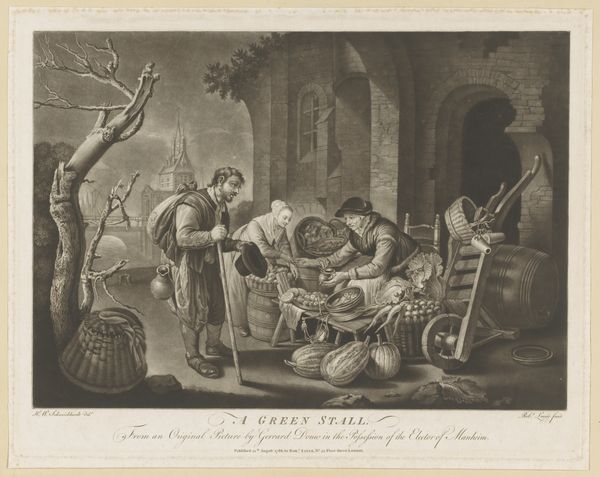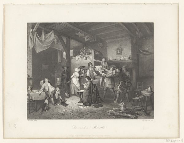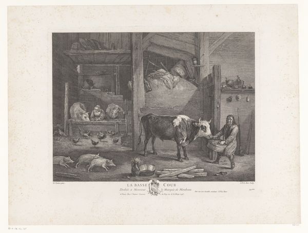 This print, "Interior with a Woman Making Sausage" was crafted by Jacques Philippe Le Bas in the 18th century. The composition, rendered in monochrome, presents a domestic scene, seemingly quotidian, yet rich in structured forms and contrasting textures. Le Bas orchestrates a play of light and shadow across the image, creating a depth that directs the viewer's eye from the foreground—where a woman prepares sausages amidst a clutter of objects—to the background where a group of men are eating at a table. The stark contrast between the rough texture of the wooden beams and the smooth surfaces of the kitchenware emphasizes the material conditions of the subjects' lives. Note the lines of the architecture, which create a grid-like structure in the background. These lines intersect with the organic forms of the figures and objects, producing a dynamic tension that destabilizes any singular reading of domestic tranquility. This formal arrangement evokes the philosophical discourses of the Enlightenment, challenging fixed meanings of labor, class and domesticity. The print invites us to reconsider the semiotic codes through which we interpret daily life.