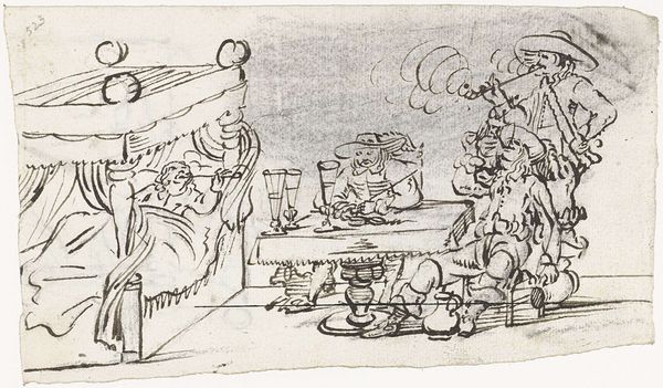 Curator: Editor: This drawing, "Dronkaards liggend in een taveerne," created around 1658 by Gesina ter Borch, offers a glimpse into a tavern scene. There’s something about the limp postures of the figures that feels…humorous, but also a bit sad. What can we unpack from this tavern scene? Curator: Absolutely. This isn’t just about tipsy figures; it reflects complex social dynamics within 17th-century Dutch society. What do you notice about the details surrounding the figures, and what might these details suggest about their place in society? Editor: Well, the composition emphasizes the excess: there are barrels stacked in the back. And the men’s fine clothing seems at odds with their disheveled state, sprawled on the floor. Is ter Borch offering a subtle commentary on the behaviors of the bourgeois males? Curator: Precisely! Ter Borch, as a woman artist during the Dutch Golden Age, would have had limited access to these spaces and activities. Think about it from a gendered perspective: How might her observation of these men, in their drunken stupor, challenge or reinforce the norms of acceptable male behavior and the prevailing attitudes toward alcohol consumption in that era? How does seeing this sketched, perhaps surreptitiously, affect how we see it? Editor: So it's a depiction and a critique at once? It is not just about showing drunken men; it's about questioning power, gender, and maybe class? It sounds so rebellious. I wouldn’t expect it! Curator: It absolutely is! She is using her art to participate in social commentary, using something that might have been ignored and subverting social conventions! And it all comes together to make something really exciting. Editor: Wow, I definitely look at the image in a different light. Ter Borch gives us a mirror reflecting on cultural context. Thanks so much! Curator: Indeed. It shows how art can provide insight, challenge norms, and open spaces for discourse about hidden narratives and identities.