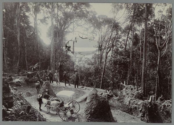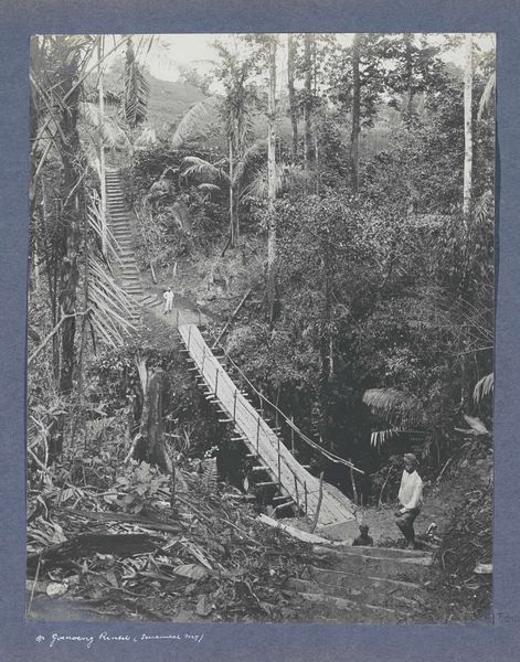 Editor: This gelatin-silver print, titled 'Leidinggevenden van plantage(s) en honden in de velden van tabaksplantage Boeloe Tjina op Sumatra,' dates from around 1900-1920. It depicts plantation managers with dogs in what looks like a Sumatran tobacco field. It’s a stark, black and white image, the rough wooden bridge cutting a diagonal through the dense foliage. What do you make of it? Curator: This photograph speaks volumes about the socio-political landscape of the time. The crisp attire of the managers, juxtaposed against the raw, almost precarious bridge and the vast plantation, visually emphasizes the power dynamics at play. It invites questions about colonial exploitation and the control over land and labor. Editor: The “Orientalist” tag feels very relevant here. How do you see that playing out? Curator: Precisely. Orientalism in art often involves a Western gaze upon Eastern subjects, frequently exoticizing orOthering' them. Here, while ostensibly a documentary image, there's a subtle staging. The managers are elevated, literally and figuratively, above the land, reinforcing their dominance. The framing of the ‘untamed’ landscape in contrast to their ordered presence creates a visual hierarchy. What’s absent is also telling; where are the workers, the backbone of this industry? Editor: So the power isn't just in what’s shown, but also in what's intentionally omitted? Curator: Absolutely. The choices made – the angle, the subjects, the very composition – construct a narrative, a carefully curated perspective on colonial life in Sumatra. Consider how this image might have been viewed by audiences back in Europe, reinforcing certain ideas about the East. It acts almost as propaganda, downplaying any tensions inherent in the colonial system. Editor: It’s fascinating to see how a seemingly straightforward photograph can be unpacked to reveal so much about the era's power structures and cultural biases. I didn’t realize how much these historical forces were subtly embedded within an image like this. Curator: Indeed. It’s a reminder that art, in all its forms, is rarely neutral. It actively participates in shaping and reflecting the society from which it emerges.