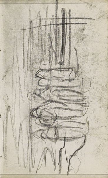 Editor: This is Anton Mauve's "Landschap met een groep figuren," a graphite and pencil drawing, made sometime between 1848 and 1888. It looks like a page from a sketchbook, a quick study of a landscape and some figures. It’s very rough, not polished at all. How do you interpret this work? Curator: The roughness is precisely what speaks to me. Mauve, working during a time of significant social upheaval, presents us with a vision that moves away from idealized portrayals of the landscape. It feels deeply personal, almost a resistance to academic formality. Do you notice how the figures seem almost swallowed by the landscape? Editor: I do, they're just scribbles really. Is that commentary on the individual’s place within society, or…? Curator: Precisely. Considering the rise of industrialization during Mauve's time, we can read this as a statement on the diminishing role of the individual, particularly the rural worker, against the backdrop of overwhelming progress. This piece might critique the power structures relegating the working class to near invisibility. What does the landscape itself suggest to you? Editor: It feels... undefined. Unfinished, even. Not romanticized, that's for sure. More realistic and, frankly, kind of bleak. Curator: It reflects a shift in artistic perspective—a move away from the picturesque towards a grittier reality. Think of the social realism that was emerging then. Mauve, perhaps unconsciously, taps into the anxieties of a rapidly changing world. Consider too the artistic legacy - this wasn't just a pretty picture, it was about making a statement. How do you think art can be a form of activism? Editor: Well, seeing how Mauve uses a simple sketch to hint at bigger social issues, I guess art can be a quiet but powerful way to raise questions. It gives us something to talk about. I didn’t expect so much depth in what looked like a doodle. Curator: Exactly! It reveals that even the most unassuming sketch can carry immense socio-political weight. It reinforces the necessity of situating art within broader intersectional narratives to fully grasp its significance. I'm glad we explored that together.