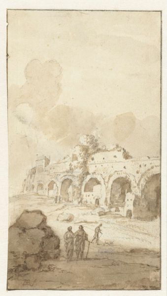 Curator: Welcome. We’re standing before Jan Gerritsz van Bronckhorst’s print, “Roman Ruins with Man and Donkey,” which dates from somewhere between 1613 and 1661. It’s an etching, showcasing a landscape punctuated by the remains of Roman architecture. Editor: It's quite evocative, a sort of melancholy scene. The ruins dominate the composition and they feel really monumental even in this small format, yet the palette makes the scene rather muted. There's a distinct sense of history, of empires past. Curator: Bronckhorst, like many artists of his time, was captivated by the grandeur of Rome and its enduring impact. This work reflects the fascination with antiquity during the Baroque period, which saw artists looking to the past for inspiration and authority. There’s a bit of an idealized vision presented here, too. Editor: Right, but beyond just inspiration, what does it signify that these artists consistently return to the image of ruins? It almost romanticizes imperial power, erasing perhaps the violence inherent in those structures, in Roman dominance itself. Who benefits from depicting the glories of Rome without acknowledging the marginalized voices, the enslaved peoples who built it? Curator: Well, the etching speaks to the tradition of the Grand Tour, a period where affluent Europeans traveled to Italy to study art and culture. Prints like these became souvenirs, emblems of classical knowledge and refinement. They perpetuated a specific understanding, a specific legacy, that underscored elite status and education. Editor: And even the choice of printmaking as a medium reinforces that. Reproducible, and therefore democratically distributed images of a hierarchical empire. Are we, in essence, re-inscribing the privilege in how we talk about the work? It reminds me of Edward Said's notion of Orientalism, of constructing narratives to assert power and otherness. Curator: It's true that art history is continually grappling with these questions, and these sorts of considerations are particularly important when considering how collections come into being and whose stories they tend to tell. Editor: It challenges us to see the layered narratives, the unseen labor, and power dynamics within seemingly picturesque landscapes, doesn’t it? It shows how representation and history-making can be potent political tools. Curator: Absolutely, it's about unraveling the social and political meanings embedded within art, and asking whose story is amplified, and at whose expense. I will carry these provocations as I continue researching how landscape is depicted, who inhabits that landscape and how. Editor: And I leave today also thinking more critically about these themes.