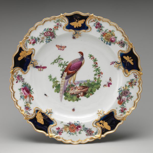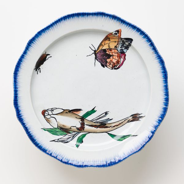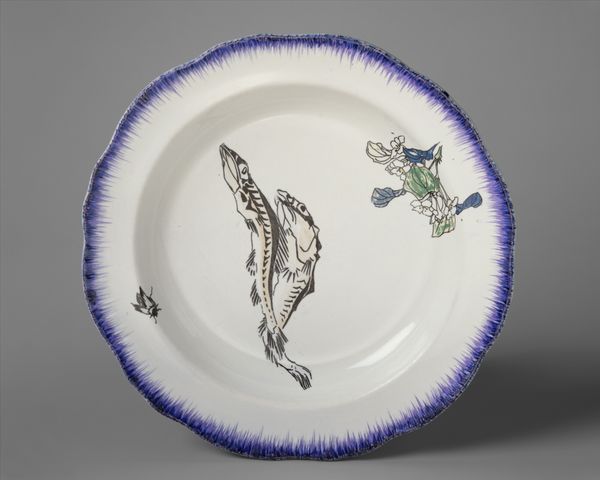 This soup plate was made by Félix Bracquemond in the late 19th century, crafted from porcelain and decorated with painted designs. Porcelain, a refined ceramic material, gains its strength and translucence from high-temperature firing, emblematic of industrial processes during the period. The smooth, white surface of this plate serves as a canvas for Bracquemond’s whimsical, asymmetrical composition of insects, plants and a turkey. The artist took inspiration from Japanese prints in the design, contrasting with the industrial mode of production. The act of painting onto a mass-produced object infuses it with individuality, softening the impact of industrialization. Consider the labor involved in both the plate's manufacture and its hand-painted decoration; the transfer of skilled artistic labor onto an object intended for everyday use complicates the boundary between art and craft. Ultimately, understanding the intersection of industrial production, artistic intervention, and cultural exchange is key to appreciating this seemingly simple soup plate.