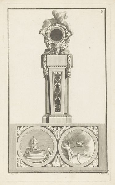 Curator: This etching and engraving is titled "Lantaarn" by David van der Kellen, created before 1878. The piece is part of the Rijksmuseum's collection. Editor: Immediately, I’m drawn to the intricacy of the metalwork. It's incredible detail, the way the light must have played across those surfaces. The image suggests a world illuminated by artisanal craft, a tangible connection to human skill. Curator: Absolutely, that level of detail points to a meticulous process of metalworking. Notice the contrasting textures achieved through etching and engraving; it's about controlling the tools and materials to generate specific effects. The work emphasizes the medieval art movement by showing examples of different design patterns of the time. It also brings to light the amount of labor required. Editor: And it's not just labor, it's intentional symbolism, too. The repetition of floral and geometric patterns... these motifs likely held deep religious or cultural significance in the medieval world, invoking notions of beauty, order, and even divinity. Curator: I wonder about the function of the lantern itself. Was it purely decorative, or did it serve a more practical purpose? Was it for domestic use, or did it light the path during religious ceremonies? Considering this reveals insights into class structures and accessibility of this level of craft. Editor: Perhaps both. The lantern as a symbol of enlightenment is something that endures across cultures, suggesting knowledge and guidance, piercing through darkness. I would wager this object meant more to its commissioner than simple utility. Curator: Indeed. And how would the value be perceived then? It must have held immense cultural significance as well as being a product that represents time, access and material. Editor: Definitely. The craftsmanship itself communicates worth, but what the lantern stood for—the hope, guidance, faith it visually embodied, those are potent messages that still resonate today. This really reminds you of the cultural and historical weight such objects carry. Curator: Seeing the techniques utilized and the material that it is produced from really connects this print to labor from the past. Editor: It's extraordinary how an image of light can reveal so much about darkness - historical context, symbolism and the enduring power of artistic intention.