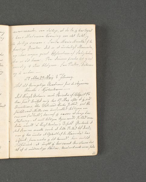 Editor: We're looking at a drawing from 1846 titled "Rejsedagbog. Brügge," or "Travel Diary. Bruges," by Johan Thomas Lundbye, rendered in pen on paper. It appears to be a page from the artist's sketchbook, filled with tightly packed script. It has an intimate, almost secretive feeling to it, given the density of the text and the personal nature of a diary. What can you tell me about this piece? Curator: The initial draw to this piece comes from the almost architectural structure produced from the visual layering and interweaving of written script. The script occupies the space to its maximum possible surface area while being bordered by a rigid margin. Can you appreciate the balance established between the controlled structural order and the almost impulsive inscription of the hand? Editor: I think so, although I hadn't considered that. It seemed quite free-form to me. Curator: Free-form, yes, but bounded! Observe how Lundbye repeats and varies the thickness of line, the spacing between letters and words, and the rhythm of ascending and descending strokes to create visual texture, similar to brushwork in painting. Consider this work outside the romanticist intention, as one solely devoted to semiotic potential and balanced compositional elements. Does this alter your interpretation? Editor: It does somewhat. It brings an interesting rigor to what initially struck me as a casual and informal work. I can see the intentionality in its construction now. Curator: Indeed, one could view the individual letters as pure, formal elements irrespective of their semantic meanings. It's a curious tension between text as communicative tool and as pure design. Editor: I see what you mean, I had previously focused on the function of it being a personal journal entry, but thinking about it as a purely visual construction unlocks new aspects.
