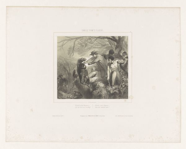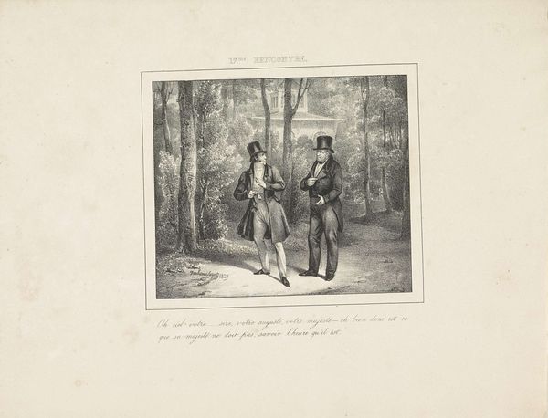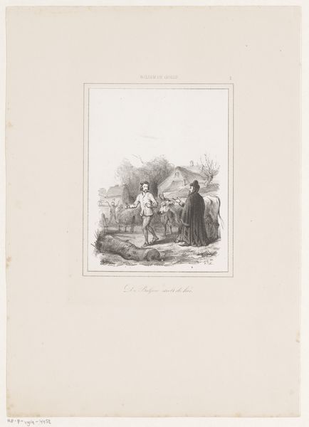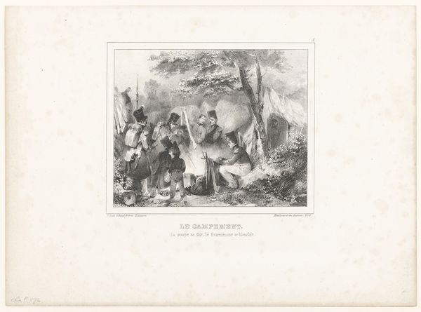 Editor: Nicolas Toussaint Charlet's etching, "Jachtopziener klaagt over zijn kostuum" from 1830, presents a somewhat humorous scene. I'm struck by how it seems to capture a specific social interaction with some irony. How do you interpret this work in relation to the society of its time? Curator: Considering Charlet’s historical context, the scene speaks volumes about class distinctions and the burgeoning middle class of 19th-century France. How does the huntsman’s complaint about his attire reflect broader anxieties around social mobility and the performance of status? What visual clues point towards his discontentment with the established order, and who might the artist be subtly criticizing through this image? Editor: I notice that he is standing apart from the finely dressed family, with tattered clothing and gesturing wildly with his arm, which implies a direct address to a problem. Perhaps this is a criticism of those in power who would rather ignore their duties and responsibilities? Curator: Precisely! The work offers a commentary on the unequal distribution of resources. Romanticism valued nature and the individual, yet, in practice, these ideals were often restricted by social class. What role does the setting play in underscoring these social differences, and how does it challenge the traditional aristocratic associations with hunting? Editor: That makes perfect sense! The family seated leisurely by a large tree seems far removed from the huntsman’s world, amplifying that visual contrast between leisure and labour. Curator: Think about the institutions of art during this time as well, who was making and consuming art, and what that meant. It reveals a critical lens on the social norms perpetuated by those institutions, as well as artistic tropes that Charlet simultaneously embraces and subverts. Ultimately, art doesn’t just reflect society; it actively participates in shaping social dialogue and challenging existing hierarchies. Editor: I see what you mean. By looking at it as social critique instead of just a simple hunting narrative, the etching carries so much more historical and cultural depth. Thanks!