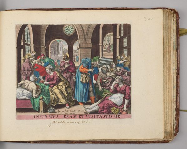 Curator: This is Hans Collaert the Elder's "The Calling of Matthew," from the Harvard Art Museums collection, printed on a sheet measuring about 27 by 36 centimeters. Editor: The scene feels dense, almost claustrophobic, with a chaotic energy emanating from the money and figures jostling around the table. Curator: Indeed. Collaert, through engraving, highlights the social dynamics at play. Matthew, surrounded by the tools of his trade, is interrupted by Christ’s call, a direct challenge to his existing socio-economic role. Editor: It’s a powerful moment, seeing Matthew’s potential transformation framed by the details of his present labor. The colors, though muted, draw my eye to the central exchange. Curator: Absolutely, there’s a dialogue here about work, salvation, and the artist’s own labor in creating this print. Editor: It leaves you pondering what Matthew will do next, and thinking about the choice Collaert made to depict it in this way.