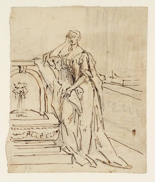 François Gérard sketched this study for a portrait of Juliette Récamier using pencil and brown wash. The composition strikes a balance between the figure and the surrounding space, creating a harmonious visual field. Gérard masterfully uses line to define form, while the minimal use of brown wash adds depth and volume. The sketch presents a figure in repose, engaging with classical ideals of beauty and form, reminiscent of ancient Greek sculpture. The linearity and the flowing drapery invite us to consider the relationship between line and surface, revealing a play between representation and abstraction. The artwork's semiotic system relies on a series of codes which point to cultural ideals of femininity, elegance, and leisure. It prompts questions about the gaze and the representation of women in art, reflecting broader social and philosophical concerns.