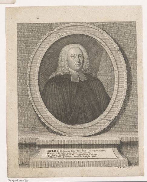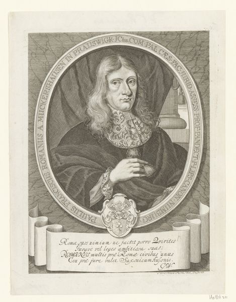 This is Bernhard Vogel's monochrome print of Johannes Wülfer. The oval composition focuses our eye on the sitter who appears to be in mid-thought. He is framed by an inscription that celebrates his intellectual status, reinforcing a sense of scholarly prestige. Vogel's formal arrangement uses contrasting textures and forms. Notice how the soft, cascading curls of Wülfer’s wig sharply contrast with the rigid, pleated ruff around his neck. This juxtaposition draws attention to the face and highlights the sitter's intellectual character, a key semiotic sign of the period. The books in the background allude to Wülfer’s philosophical and geographical pursuits. The structural clarity of the print, combined with its symbolic details, invites us to consider how portraiture in this era functioned as a carefully constructed representation of identity and social standing. This approach destabilizes a straightforward interpretation, prompting a deeper reading of the visual and cultural codes at play.