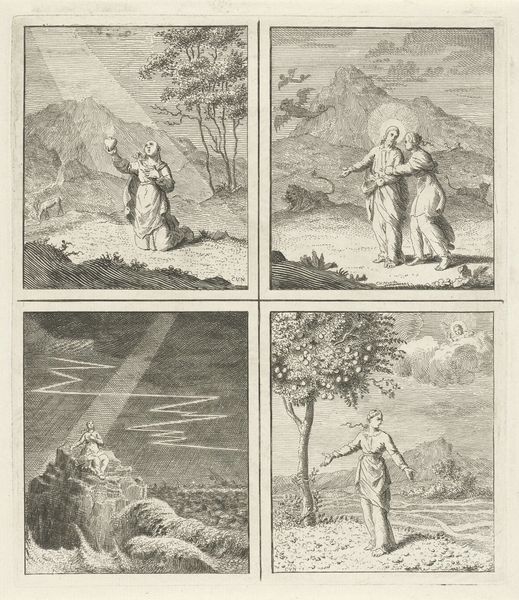 This engraving by Cornelis van Noorde, made sometime in the 18th century, presents four scenes within a single frame, each a vignette of Christian allegory. The composition, with its clear lines and structured arrangement, invites us to consider how the narrative unfolds across these quadrants. Each scene is meticulously rendered, using the stark contrast of light and shadow to guide our eye. Notice how van Noorde employs line to define form and create depth, particularly in the landscapes and the figures’ drapery. These visual elements construct a semiotic system, where objects and gestures carry symbolic weight: the sword, the cross, the narrow gate, and the offered heart. They invite us to decipher the moral and spiritual lessons embedded within. Van Noorde uses the structure of the print to engage with ideas around salvation and morality. The arrangement of these scenes asks us to consider how each narrative element contributes to a larger discourse on faith, sacrifice, and the human condition. In its totality, this work is not merely a visual object but a structured argument about the pathways to spiritual fulfillment.