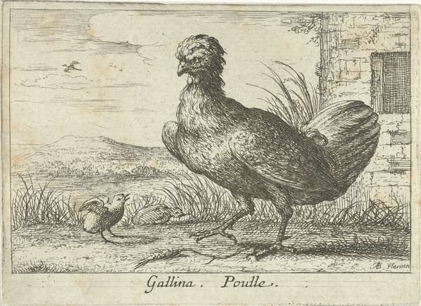 Jacob Gole created this engraving, "Rooster with Chicks," sometime between 1660 and 1737. The composition is dominated by the rooster, its form meticulously rendered with fine lines to create texture and depth. The contrast between the rooster and the softer, blurred background evokes a sense of depth and realism. Gole's technique, relying on line and tone rather than color, invites us to consider the semiotic power of black and white. The rooster, depicted in great detail, stands as a signifier of domesticity and rural life. The precision of the lines gives a formal quality to the work, freezing the scene. What is striking is how Gole’s artistic choices reflect the broader interest in naturalism during the Dutch Golden Age. The very act of creating an artwork of something so familiar elevates the subject to a new level of cultural discourse, subtly challenging traditional hierarchies within art itself.