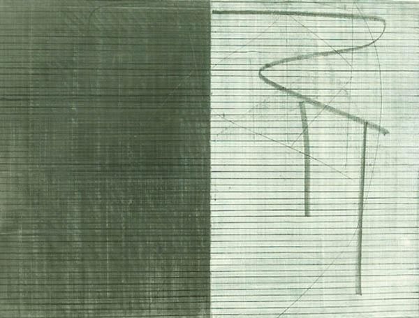 Moshe Kupferman made this "Untitled" work with pencil, ink, and graphite on paper. Just by looking, you can see the physical, repetitive process he must have gone through. The surface is covered in these regimented grey stripes, like he was trying to create a textile. But then, Kupferman interferes. You can see subtle marks, like a ghost drawing, which break the surface. It’s almost as if he's trying to disrupt the regularity of the stripes with these faint gestures. I wonder what that’s about? Maybe it’s a metaphor for memory, or just a quiet rebellion against the grid. Agnes Martin also worked with grids, but Kupferman is a different animal altogether. Where she's all about meditative calm, he seems to be hinting at something hidden, something unresolved. Art’s great because it leaves space for these unknowns.