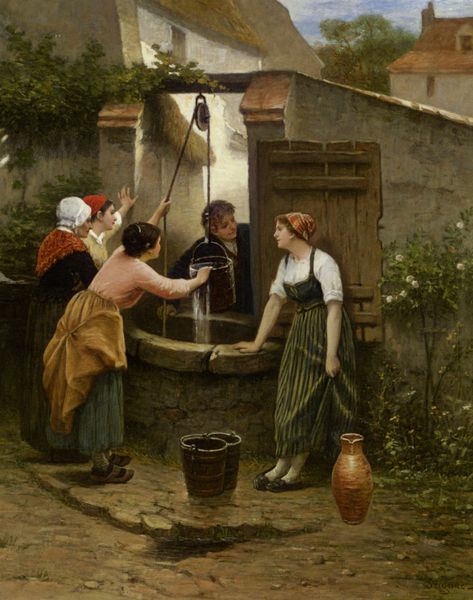 Eugene de Blaas painted ‘Catch of the Day’ in the late 19th or early 20th century, depicting a vibrant scene of everyday life in Venice, Italy. It offers a glimpse into the social dynamics of the time, particularly the roles and interactions of working-class women. De Blaas uses visual cues to create meaning. The women are positioned prominently, engaged in work and social interaction, while the men appear more as background figures. This might suggest a focus on the female experience within this community. The setting, a narrow street, hints at the close-knit nature of Venetian life, where public and private spaces blur. To truly understand this painting, one would need to delve into the social and economic conditions of Venice at the turn of the century. Researching the roles of women in Venetian society, their economic activities, and the social structures that governed their lives would provide richer insights into the painting's meaning. Art history, ultimately, is inseparable from social history.