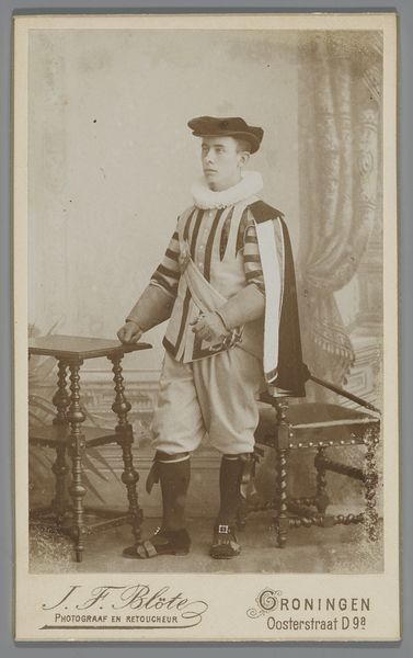 Here is a photograph by Jan Frederik Blöte of an unknown student from Groningen dressed in a masquerade costume. The ruffled collar and the cape with decorative trim evoke a sense of theatricality and disguise. This costume acts as a symbol of transformation, hinting at the fluidity of identity, much like figures in commedia dell'arte. These traditional characters wore masks, leading audiences to question who they truly were beneath the façade. Consider the recurring motif of the mask throughout history, from ancient Greek theatre to carnival celebrations. It is an archetype deeply rooted in the human psyche, a symbol of hidden desires and societal roles. This echoes the ritualistic use of masks in ancient ceremonies, meant to channel spirits or embody ancestral figures. The student's confident pose suggests an embrace of this transformative power, inviting us to reflect on our own masks and the roles we play in the theater of life.