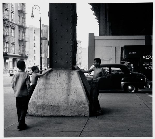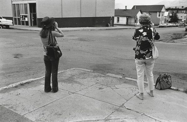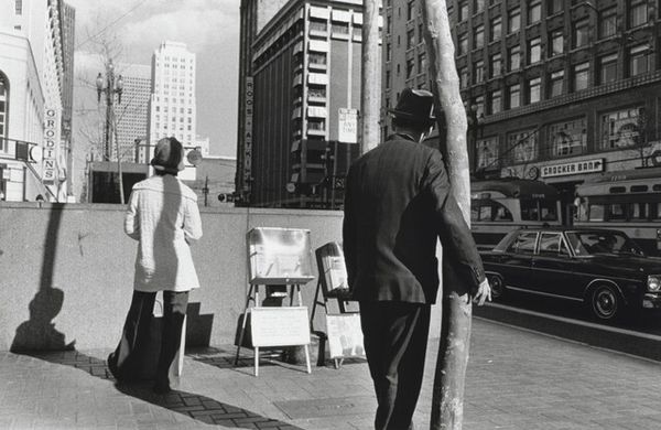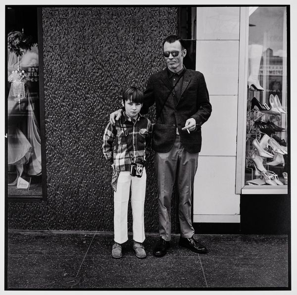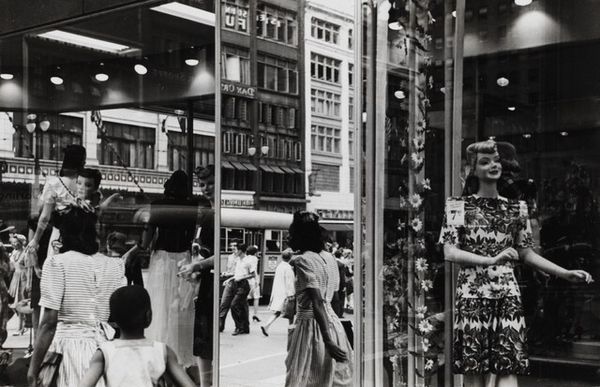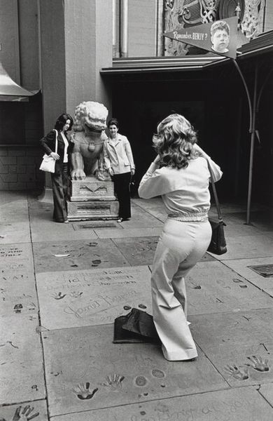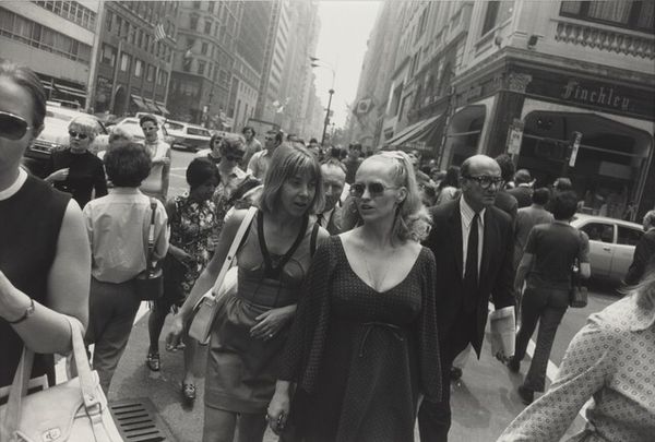 Curator: This gelatin silver print, entitled "Washington, D.C. #3," was created by Anthony Hernandez in 1975. Editor: It has a curiously intimate feel for a street photograph. I’m immediately drawn to the interplay of textures; the marble of the building versus the sidewalk and the patterned clothing of the women. Curator: Indeed, it’s interesting how Hernandez focuses on the quieter moments of urban life. Consider how this image, rendered in stark monochrome, still manages to communicate a sense of bustling city life with a touch of detached observation. Look closely at the expressions, the attire—what might these figures symbolize about Washington, D.C. at the time? Editor: The contrasting social stratifications on display really drive home the feeling of detached observation. There's a raw elegance in the composition; the deep blacks and bright whites define planes that highlight the subjects in a candid manner. Curator: Precisely. This kind of unposed composition can tell us so much. For instance, note the ‘Dean Witter’ sign in the background—suggesting finance, commerce, but also, perhaps, a certain social stratum juxtaposed with the individuals on the street. Does that speak to the symbolism embedded within the ordinary urban landscape? Editor: Perhaps a nod towards capitalistic enterprise as backdrop, the solid rectilinear forms adding a rhythmic structure against the more organic and fluid forms of the people. The choice to shoot in black and white does add an almost documentarian element, though. Curator: A conscious decision, undeniably. Black and white removes distractions, leaving behind what some call “the truth” or the perceived essence of a moment. In a cultural context, what lasting effects could these stark contrasts carry forward in the psychological narrative? Editor: I find myself questioning how such contrasts define not only space within the image but the experiential space between observer and observed. Ultimately, the starkness reinforces that urban isolation we find ourselves analyzing. Curator: Well observed. I'd suggest anyone drawn to these visual contrasts investigate what other street photography may uncover about our psychological engagement within social fabrics and symbols. Editor: A sentiment to which I'd echo; consider the image not merely as captured reality but an expertly-framed exercise exploring texture and human presence.