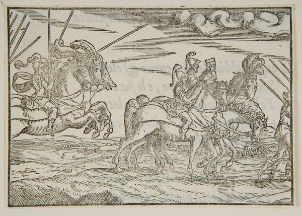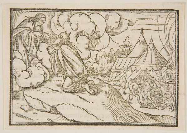 Editor: This is "Daniel IV" by Hans Holbein the Younger. It’s a woodcut, I believe. It has a slightly eerie feel to it, with the figures huddled in what looks like a furnace. What symbolic meanings do you see in this piece? Curator: The furnace and the figures within are visually arresting, aren’t they? Consider the furnace not just as a place of literal heat, but as a crucible of transformation. What emotions do the figures' posture evoke? Editor: They seem fearful, huddled together as if seeking protection. Curator: Precisely. And who watches them? What does their posture communicate? Holbein is evoking a narrative. Editor: The king on horseback seems powerful and indifferent. Curator: That is one reading. By arranging and rendering the figures, Holbein guides us to contemplate power dynamics. Editor: I see. So it's about the persistence of memory and the impact of those power dynamics over time. Curator: Indeed. Visual symbols are potent carriers of cultural memory. We bring our own experiences to bear on them, thus giving them new life.