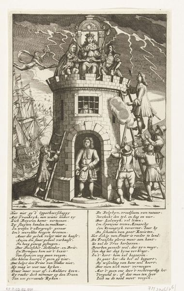 Editor: Here we have “De partijen vechten om Castilië,” or “The Parties Fighting Over Castile,” an engraving from 1706. The artist is anonymous, but it’s currently housed at the Rijksmuseum. It strikes me as a rather dense, symbolic representation of a historical event, with all these figures surrounding a tower. What can you tell me about this piece? Curator: This engraving is a fascinating example of political allegory during the War of the Spanish Succession. The tower itself is Castile, and the figures vying for control are symbolic representations of the various European powers. Notice the lightning bolts striking nearby, signs of upheaval and divine will perhaps? Editor: Yes, I see them. And what about the figures on top of the tower? Curator: They represent the rulers involved in the conflict. Each figure embodies their nation’s aspirations, fears, and cultural identity projected onto this conflict for control. And below, who do you see inside the tower? Editor: Looks like a lone man. He looks imprisoned. Is he supposed to represent the people of Castile? Curator: Precisely. He's trapped within the conflict, suggesting the plight of the Castilians caught between these powerful factions. Consider the act of ascending. How many parties are needed to accomplish their desires? What must occur? Editor: So, the print is more than just a record of the war. It's loaded with visual metaphors. I see the ladders symbolizing their aspirations, a certain amount of risk, the promise of elevation, and maybe also deceitful tactics. Curator: Exactly! And notice the ships in the background—naval power was crucial in this conflict, representing control over trade routes and colonial possessions. So it presents a powerful visual argument, rooted in contemporary anxieties and aspirations. Editor: This engraving really unpacks the complexities of power and the use of symbolism to convey political messaging. Now I am seeing it as a story filled with dreams and the hidden costs that these ambitions often imply.