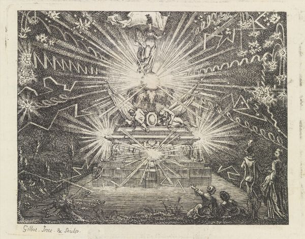 Editor: Here we have Daniel Marot’s "Fireworks on the Hofvijver to Celebrate the Victory at Vigo, 1702," an engraving from 1702 currently held at the Rijksmuseum. It's a dramatic depiction of a cityscape illuminated by fireworks. What do you see in this piece, especially beyond just a historical record? Curator: It’s fascinating how this image attempts to marry power and spectacle. The fireworks aren't just aesthetic; they’re performative assertions of Dutch military strength after the Battle of Vigo Bay. Consider the context: the Dutch Republic, a burgeoning power, uses this public display to solidify its dominance in trade and warfare. Who is this performance aimed at, and what does it mask? Editor: I hadn’t thought about it that way, more like documenting an event. Are you suggesting that it’s more than just that; it's political theatre? Curator: Exactly. The city is almost overwhelmed by the sheer force of light and symbolic chaos. Think about the resources required for such a display. It speaks to an enormous investment in projecting an image of invincibility, masking perhaps internal vulnerabilities or the human cost of the war. Where are the faces of those who were affected by this battle? Editor: That is such an interesting point. It presents a very top-down view, focusing on celebration but perhaps silencing other narratives related to the conflict. Curator: Precisely! Whose stories are missing here, and how does that impact our understanding of this event and its representation? It also begs the question of how state-sponsored displays function today, promoting nationalism and obscuring the complex realities of conflict. Editor: It’s made me think differently about how historical artwork can be interpreted through social power dynamics, I appreciate it!