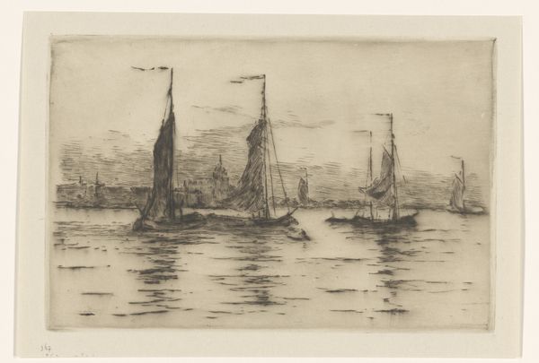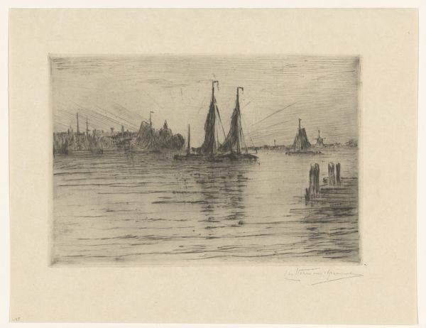 Curator: "Gloucester Harbor" by Charles A. Platt, etched in 1880. It's a remarkably detailed waterscape. What are your initial impressions? Editor: It's a muted palette, almost monochromatic, which immediately casts a serene yet slightly melancholic mood. The vertical lines of the masts against the horizontal expanse of the water—it's formally very striking. Curator: There is an atmosphere of quiet industry, isn't there? The etching medium lends itself so well to conveying the density and the intricacy of a working harbor, a network that facilitates more than a transaction between people and their needs. Editor: Precisely. The restricted tonality enhances the textured surface and allows a focus on linear compositions; notice how line variations affect atmospheric recession. The artist created something remarkable with tonal control despite the subdued palette. Curator: Consider Gloucester as an idea, and all harbor settings—these busy points are like our points of consciousness between our personal internal landscape and something larger than the self. We build monuments around such meeting points, our buildings for industry and social life in and of themselves serve as memorials, of sorts. The smoke from a single building stands in contrast to the silence otherwise captured in the medium. Editor: And that is exactly the formal tension here. Platt created complexity, then, by suggesting an additional element via the column of rising smoke from that particular building, effectively piercing and distorting a very controlled setting with something of chaotic potential. That simple image creates more of that essential balance by directing the gaze upwards. Curator: It certainly amplifies that symbolic tension between the temporal, the ephemeral gesture of smoke, versus the fixed permanence the etching tries to evoke. Platt seems to suggest a cultural space marked by the meeting of these opposing aspects. Editor: That juxtaposition and controlled hand helped contribute to a contemplative stillness, ultimately. A superb command of line and shade gives Gloucester a palpable visual language of its own. It is more than just the depiction of harbor life but, at this distance of time, an almost perfectly recorded, isolated world of shape and suggestion. Curator: Beautifully said, a potent snapshot from the shores of our shared past.