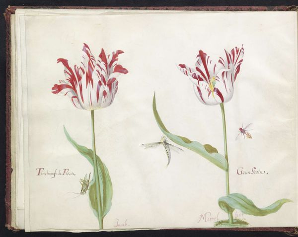 Curator: Before us is Jacob Marrel’s "Two Tulips with Beetle and Wasp," painted in 1637, currently residing at the Rijksmuseum. What are your initial thoughts? Editor: The crispness of the watercolor is striking. There is an inherent stillness to this image. The delicate lines, the muted vibrancy… it’s very contained. Curator: Indeed. The choice of watercolor lends itself to the intimist nature of this work, allowing for a depiction with a strong attention to detail. But I'm more curious about how this botanical illustration reflects the speculative tulip market during the Dutch Golden Age. Were these precise images part of a trade driven by images and desires? Editor: The hyper-realism certainly gives it a commercial feel. Although it is so elegant and measured, it must have held allure for buyers looking to trade the rarest tulip bulbs. I'm looking closely at the way the artist captured the distinct variations in the petals, so thin that light comes through the crimson lines. Note the contrast, almost metallic against the greens of the leaves and stems. Curator: These illustrations could function almost as prototypes in the hands of artisans creating luxury goods, extending the tulip craze into material culture for a wider market. The integration of insects invites reflections on the cycle of growth and potential fragility—further feeding into a speculative market. Editor: I’m fascinated by how the artist handled the composition. The subtle placement of the wasp and beetle gives a sense of balance and introduces the notion of ephemeral beauty, which could refer to how fortunes bloom, only to wither. The precision hints at the high cultural value attached to tulips. Curator: Marrel wasn't just an artist; he was part of the entire network surrounding cultivation and trading. This image reveals connections between natural production, the labor of creating an image, and the mechanisms of wealth creation. Editor: Yes. When looking beyond pure aesthetics to see Marrel’s understanding of material and symbolic worth during the Tulip Mania, the composition seems carefully designed, which allows for the reading of deeper economic layers of meaning. Curator: It highlights art's participation in a transformative moment of commodity culture. Thank you, it is a perfect note to end on. Editor: Yes, absolutely; a real intersection between artistry, trade, and the beauty of Dutch Golden Age paintings.
