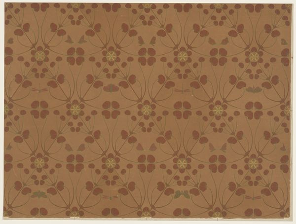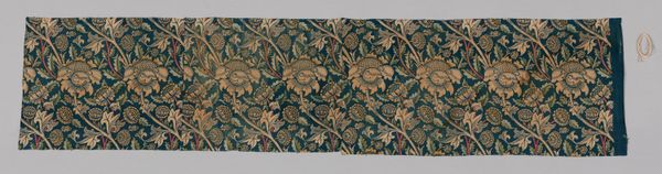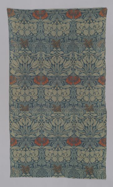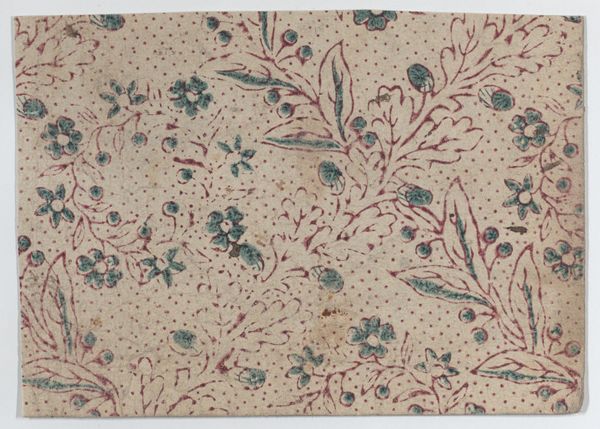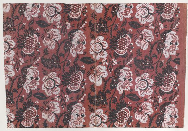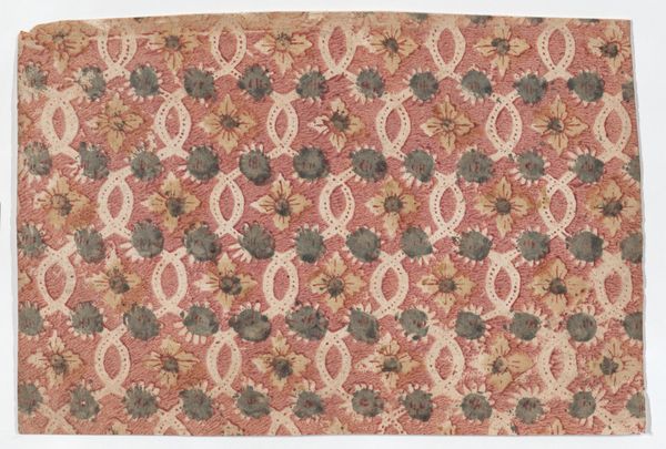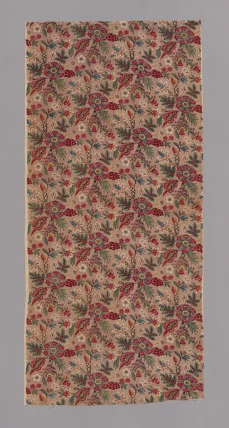 This "Piece" was created by the Oberkampf Manufactory between 1760 and 1843. Notice how the textile is dominated by a symmetrical, repeated pattern. The design features stylized floral and foliate motifs in red, green, blue and beige against a muted salmon backdrop. This pattern’s regularity gives rise to questions about repetition and seriality. The artwork reflects broader artistic and philosophical concerns of its time. The structured arrangement of the print, with its grid-like organization, can be interpreted through the lens of structuralism. It uses a semiotic system of signs where each motif contributes to the overall visual language. The repetition and symmetry create a sense of order, but the variations in color and form disrupt complete uniformity, challenging the idea of fixed meanings. Consider how the textile’s formal qualities, such as its balanced composition and repeated patterns, play a role in its reception and ongoing interpretation.