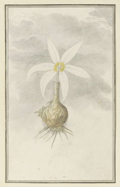 Robert Jacob Gordon created this watercolor drawing of a Gethyllis Britteniana. The composition features a central, vertically oriented plant with bulbous roots and delicate, curling tendrils. The restrained palette of muted greens, greys, and whites gives the illustration a scientific, almost taxonomic feel. Gordon’s careful observation of the plant’s structure—its roots, bulb, stem, flower, and ghostly tendrils—invites us to consider the relationships between the parts. The bulb sits grounded, while the flower reaches upwards in a sinuous curve that is both natural and stylized. The subtle washes of color create depth, accentuating the contrast between the plant's organic form and the flat, neutral background. The plant's ethereal quality is enhanced by Gordon’s delicate use of line and color. This drawing presents an object of both scientific curiosity and aesthetic contemplation, highlighting the formal beauty inherent in natural structures.