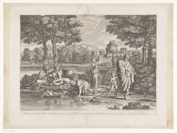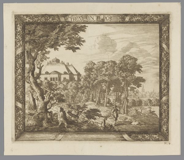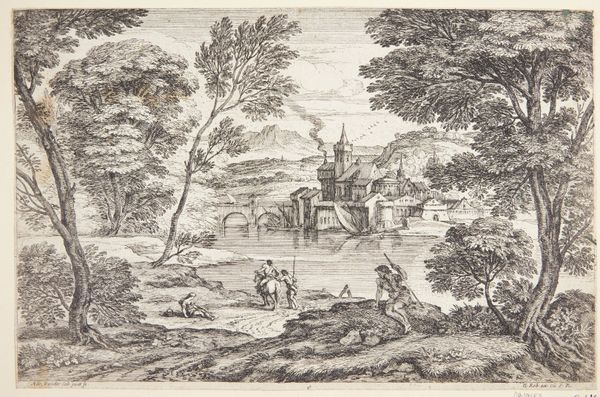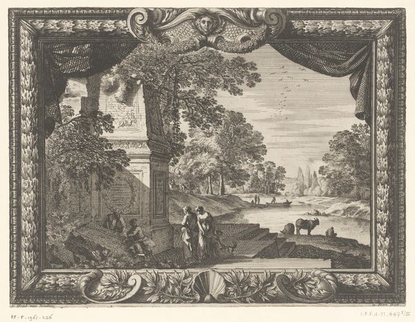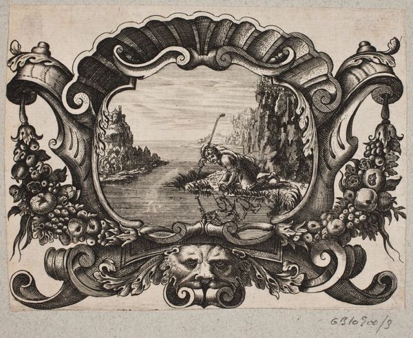 Editor: We're looking at "Vignette of Tobias and the Angel," an ink drawing and print on paper, date unknown, housed here at the Art Institute of Chicago, profile by an Anonymous artist. I'm immediately struck by the elaborate framing device around the central scene; it almost overwhelms the narrative itself. What can you tell me about how its composition speaks to you? Curator: The juxtaposition is indeed the key. Consider first the framing: its ornate detail, the almost excessive display of vegetal forms, all meticulously rendered in pen and ink. It presents a contained world, a microcosm of artistic skill. Now, direct your attention to the vignette itself. What structural elements do you observe? Editor: Well, the figures are placed rather small within a sprawling landscape, creating a sense of distance, maybe even vulnerability. The light seems to be coming from the left, casting long shadows, and the architectural elements in the background—are those ruins? Curator: Precisely! The use of light and shadow establishes depth and volume, guiding the eye through the pictorial space. The artist employed ink washes to define the atmospheric perspective and to suggest forms fading into the distance. Consider the pen work: dense cross-hatching creating darker areas in the foreground contrasted with delicate, sparser lines evoking distant objects. This intentional juxtaposition invites questions. Editor: So the contrast between the wild nature within the scene and the controlled ornamentation around the borders emphasizes the scene's... fragility? That tension almost makes it more dramatic, don't you think? Curator: Precisely. Furthermore, observe how the composition itself echoes elements within the frame. Notice how lines repeat, echoing curvatures of foliage and gesturing figures into dialogue. It underscores visual rhyme to draw attention toward this delicate balance across thresholds: wilderness and garden or devotion and decoration; they both have shared design structures which complement, yet never completely unite under unified direction. What might be at stake, in this eternal divergence? Editor: That's fascinating! I hadn't thought about the repetition of line creating echoes, it seems like an attempt to harmonize themes into shared aesthetic language. I guess looking so closely at form can lead to deeper interpretive insights, or simply generate a cascade of compelling artistic insights. Curator: Precisely, precisely. Analyzing form not only shapes aesthetic preference. We gain analytical leverage over decoding artwork through visual analysis!