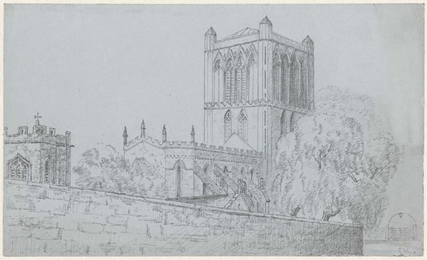 Editor: This engraving, "The Grèves from the Summit of Mount St Michael" by Clarkson Stanfield, shows such intricate architectural detail. What hidden stories do you think are embedded in this image? Curator: Look closely at the Gothic architecture reaching towards the sky. Does it remind you of anything? The aspiration for heaven, perhaps, or the assertion of power? Consider also how the landscape grounds the structure; the visual dialogue between the earthly and the divine is rich with symbolism. Editor: That’s interesting. I hadn't considered how the landscape interacts with the religious architecture. Curator: Visual symbols speak volumes. This tension between the sacred and secular encapsulates centuries of cultural memory, don't you think? What do you make of it? Editor: This makes me see it in a completely different light. Thanks for your perspective!