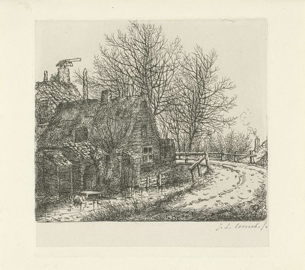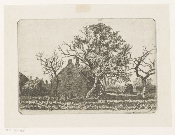Henriëtte de Vries created this etching, titled 'Meerhuizen aan de Amsteldijk,' a location that hosted the exhibition "De Vrouw”. The printmaking process, etching, involves skilled labor and a deep understanding of materials. To make it, an artist covers a metal plate with a waxy, acid-resistant substance, then draws through it with a sharp tool, exposing the metal. The plate is then immersed in acid, which bites into the exposed lines, creating grooves. Ink is applied to the plate, filling the grooves, and then the surface is wiped clean. Finally, paper is pressed onto the plate, transferring the ink and creating the print. Here, the fine lines of the etching beautifully capture the architectural details of the house and the surrounding landscape. You can almost feel the crispness of the air and hear the rustling of leaves. De Vries’ careful attention to detail reminds us to value the skill and artistry involved in all forms of making. Whether it's a grand painting or a simple print, each artwork is a testament to human creativity and effort.