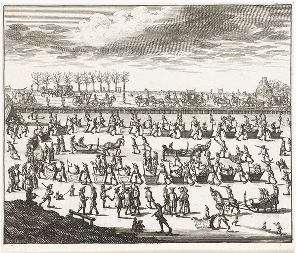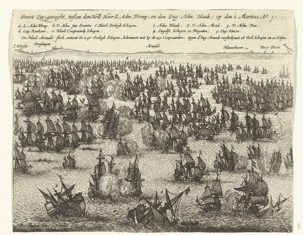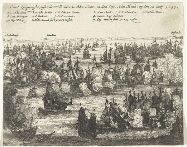 Curator: This artwork presents a birds-eye perspective, a literal battleground teeming with tiny vessels amidst the billowing smoke of naval warfare. Editor: Indeed, it’s quite overwhelming, isn’t it? Such density conveys chaos, a real sense of urgency. But let's delve into its context. The piece, dating from between 1654 and 1656, depicts the "Sea Battle of Nieuwpoort between the Dutch fleet under Tromp and the English fleet under Monck, 1653." It's rendered as an engraving, a type of print. Curator: Right, the sociopolitical implications resonate so powerfully. Naval battles such as this were really about empires clashing, and the human cost of such political ambition is often downplayed. Do you see that also? Editor: Absolutely, this naval engagement clearly mirrors Anglo-Dutch rivalry, competing imperial aspirations during a critical period. Beyond the historical context, the piece showcases Dutch Golden Age and Baroque influences. There's the dynamic energy characteristic of Baroque, alongside a precision and a clarity of detail often seen in Dutch Golden Age art, a need to present factual data. Curator: Which might tell something about it being printed. The very act of creating a print suggests an intention for wide distribution, reaching beyond elite circles. How did images like this bolster national pride, or villainize the opponent, thereby solidifying identity and fueling further conflict? Editor: Print served to disseminate propagandistic and political ideas—shaping public understanding of conflicts, but one could also imagine it being presented alongside economic or demographic analyses. Images of battles would also have served as status statements of geopolitical affairs for the period and even today. Curator: Precisely! And even in terms of gender, how did they frame male identity around notions of conquest, control, and naval prowess? What roles, if any, were afforded to women in such depictions? It opens up so many lines of questioning on identity, race, and societal values in the historical frame and how that connects to what it still is today. Editor: Looking closer, I am struck by the intricate layering—smoke obscuring, partially revealing other boats. As we close, I recognize more deeply now that it operates on numerous levels—as document, historical narrative, and as a crafted representation intended to resonate with its specific socio-political moment. Curator: For me, viewing art is like excavating shared past. I want to question the accepted views in my efforts to construct meaning. The beauty is in that journey and not any final reading.