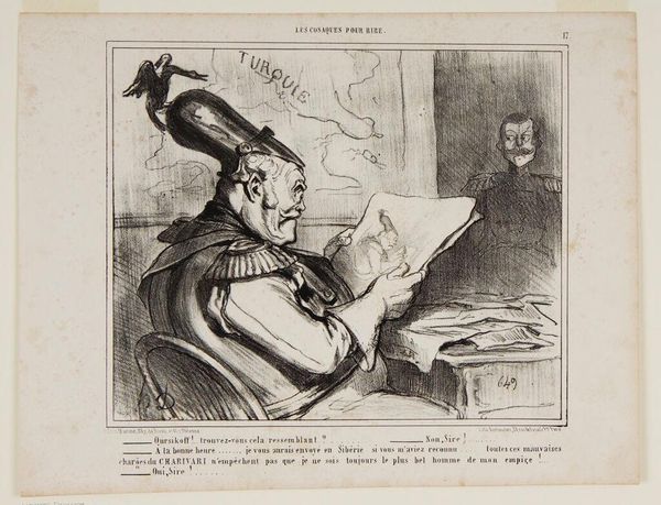 Honoré Daumier's lithograph presents a satirical scene, dominated by stark lines and contrasting tones that amplify its critical edge. The exaggerated features of the characters, rendered with energetic strokes, immediately convey a sense of caricature and critique. The composition, with its emphasis on the foregrounded figure and the presence of a looming portrait in the background, creates a visual hierarchy that underscores themes of power and representation. The figure's distorted features and the absurdity of his attire challenge conventional notions of authority. Daumier's use of line and shadow serves not only to depict physical form, but also to convey the psychological state and moral character of his subjects. This lithograph destabilizes established values by skewering the pomposity and self-regard of those in power. Daumier uses the visual language of caricature as a semiotic tool to critique the ruling classes. It’s a reminder that art can serve as a powerful means of challenging dominant narratives and prompting viewers to question prevailing social structures.