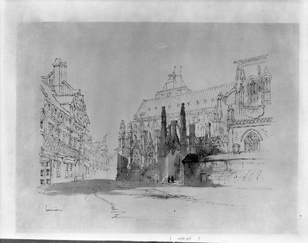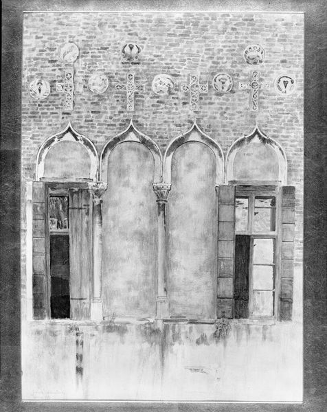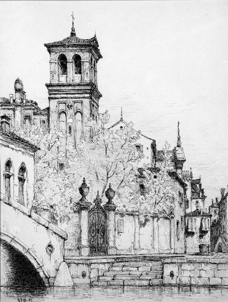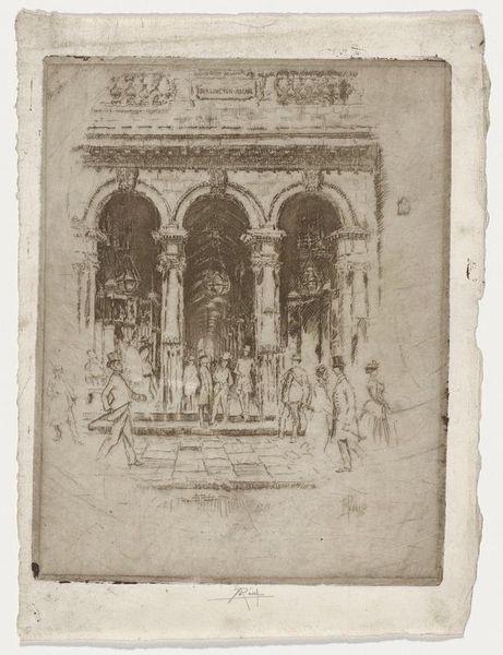 Curator: Here we have James Abbott McNeill Whistler's etching from 1880, "The Balcony," one of his Venetian scenes. What strikes you first about it? Editor: Immediately, it's the sketchiness, the rawness. You see the bones of the scene, the marks of the tool… it feels honest about its making. Curator: It’s a wonderful example of his Impressionistic style. The fluidity he achieves with etching is quite something. Do you think that apparent rawness reveals something about the materials? Editor: Absolutely. Etching allows for that directness, doesn’t it? It’s less about polished perfection and more about capturing a fleeting impression. The copper plate itself is a vehicle for this. How he uses the acid resist to create those subtle textures. It feels like he embraces the industrial process while bending it to his aesthetic will. Curator: I find it quite magical how he hints at form, suggests a detail, then lets the eye complete the picture. The Balcony appears to be, in many ways, almost dreamlike, though the balcony itself appears quite heavy with detail. Editor: Yes! The interplay between detail and deliberate omission. And it does make you wonder about the laborers involved, those craftspeople making the etching tools, preparing the copper plates, mixing the acids...all those hidden hands that facilitate Whistler's vision of Venice. He elevates craft, but always within a structured system of making. Curator: The entire scene does come alive—even with the minimal details. But as with most prints, there's always some amount of duplication here that slightly shifts the focus, doesn't it? How it changes across each impression? Editor: Right. Each pull from the plate will be subtly different, influenced by pressure, ink density, even the paper itself. Which adds another layer to that industrial yet handmade feel, blurring those boundaries again. Each print is an original, in its way. I leave feeling impressed with how deeply intertwined material processes are with an artist's sensibility and the creation of atmospheric depth.