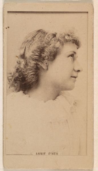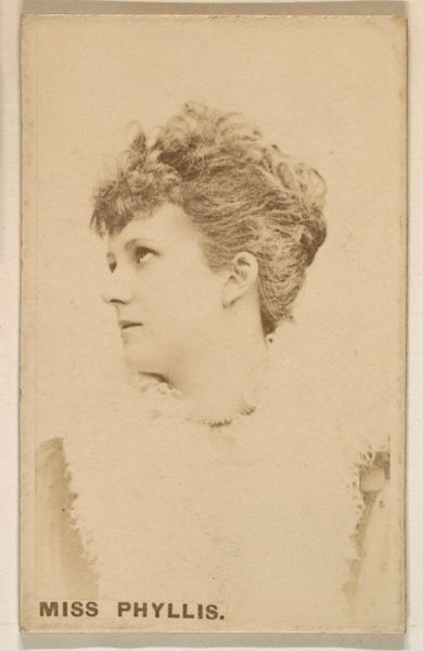 Editor: Here we have "Miss Williamson," a promotional print from the Actresses series by Kinney Brothers, around 1890. It's a lovely, soft portrait, almost ethereal in its simplicity. What do you see in this piece? Curator: It's crucial to recognize these seemingly innocuous images as active participants in constructing and circulating ideas about femininity and celebrity in the late 19th century. Tobacco companies wielded significant power, and these cards, distributed with cigarettes, were tools used to not only sell a product but also to shape cultural norms. What kind of norms do you think this card enforces? Editor: I suppose it romanticizes a very specific, unattainable beauty standard, a white, delicate femininity. Curator: Exactly. Consider also how actresses, even then, navigated complex terrain. On one hand, they achieved a degree of visibility and agency unheard of for many women. On the other hand, they were perpetually objectified, their images commodified and disseminated in ways that stripped them of control over their own narratives. The male gaze is prominent here, wouldn't you agree? Editor: Definitely. It makes me think about how marketing then, as now, exploits identity for profit, packaging women and selling them alongside other goods. Curator: Precisely. The pose, the soft lighting—it's all carefully orchestrated to appeal to a male consumer base, reinforcing particular ideals of feminine allure, but we might want to investigate who made those decisions. Did the actresses collaborate and provide input, or did they passively sit for photoshoots with prescribed direction? What can this teach us about the agency of the female figure depicted, or even her representation in mass media? Editor: That makes you really consider the complexities behind such an ordinary card. It is both a reflection of, and a contributor to, the gendered politics of its time. Curator: Indeed. By critically examining these historical images, we can learn much about the construction of identity, power dynamics, and the long history of visual culture's role in shaping our perceptions.