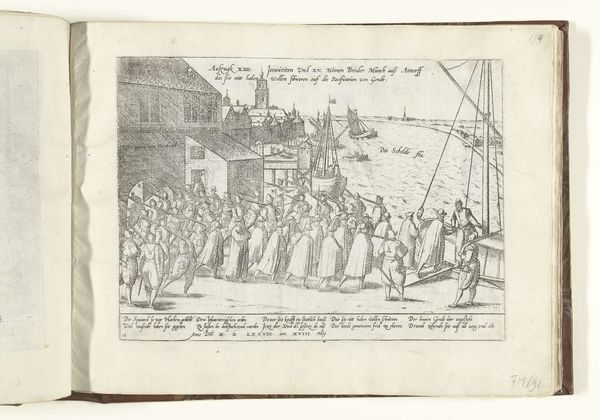 Curator: Here we have a print titled "Jezuïeten en Minderbroeders verlaten Antwerpen, 1578," likely created between 1613 and 1615. The artist remains anonymous. Editor: It’s striking! The contrast is stark, and the sheer number of figures squeezed into the composition makes it feel really dynamic, if a bit claustrophobic. Curator: Absolutely. This piece documents a specific historical moment: the expulsion of Jesuits and Friars Minor from Antwerp in 1578 amidst the religious and political turmoil of the time. This occurred in a period of the Dutch Revolt against Spanish rule and the evolving religious landscape in the region. The city's politics, swayed by various factions, resulted in this ejection, captured here with clear visual narrative. Editor: It is interesting to think about printmaking’s role then as a means of propaganda or, at the very least, public record. Engravings like this were relatively reproducible, which is a real contrast with unique works, allowing for wider distribution of information—or perspectives, in this case. Do we know anything about who this was created for, in terms of an audience? Curator: We can infer an intended audience deeply invested in the religious conflicts of the time. The inscriptions in Latin suggests an educated readership, maybe within the scholarly or clerical circles that were very opinionated on those events. It's difficult to be precise. Editor: Thinking about the materials, that fine detail, etched with incredible precision, must have required significant skill and labor. The process is part of what informs how the social tensions and conflicts of the time were perceived, made visible, and consumed, quite literally. Curator: Precisely, from a historical perspective, the visual language in this print gives valuable insight into the complex religious and political narratives circulating at that time and into the artistic techniques that aided the transmission of these narratives to wider audience groups. Editor: Seeing all these little pieces in this medium make it interesting and help one realize how vital and resourceful such simple ways of making art are. Curator: It reminds us of the enduring role of visual communication during conflict, both then and now.