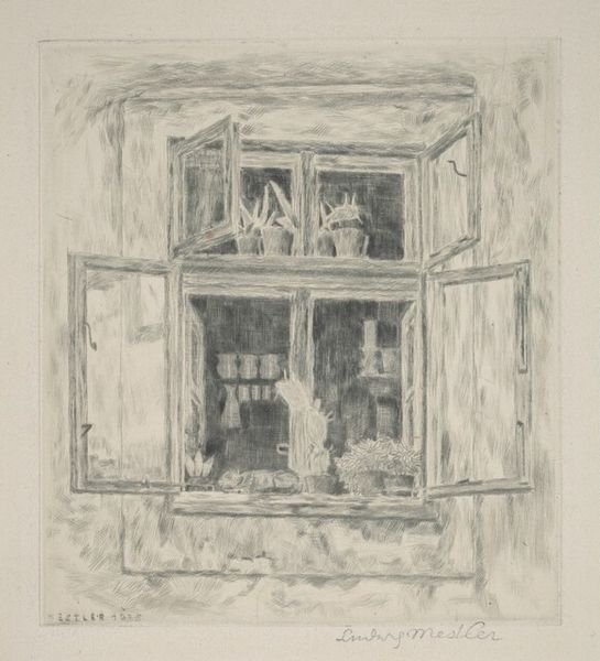 Curator: The Harvard Art Museums hold this print titled "The Hay Barn" by Childe Hassam, an artist known for his Impressionistic cityscapes and landscapes. What strikes you first about this image? Editor: The sheer volume of it all! The hay seems to be bursting at the seams, contained only barely by this rustic structure. It evokes a sense of abundance, of nature's bounty. Curator: Indeed. Barns like these were cultural anchors in rural communities. Hassam, although associated with urban scenes, often depicted such subjects, reflecting a nostalgic view of agrarian life during rapid industrialization. Editor: I see the hay as a symbol, then. Is it standing in for more than just dried grass? Is it perhaps representing a simpler, idealized past, contrasting with the anxieties of modernity? Curator: It’s certainly a potent symbol, touching on themes of preservation and memory. Hassam captures this space as both functional and deeply evocative. Editor: A poignant visual document, revealing not just a place, but also a cultural longing for a bygone era. Curator: Exactly. Hassam's "Hay Barn" allows us to contemplate the shifting landscapes of American identity.