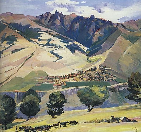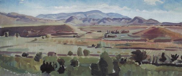 Konstantin Bogaevsky created this watercolor landscape of Crimea. The composition is structured around a muted palette of earth tones. The hills roll gently, contrasted by the angular geometry of the houses nestled within. Above, the sky blends soft blues and grays, suggesting a tranquil overcast day. Bogaevsky’s approach is less about capturing a realistic depiction of nature, and more about constructing an idealized world. This is not merely a landscape, but a carefully arranged set of forms. The houses serve as visual anchors, their structured shapes playing against the natural curves of the hills. The textures are subdued, with washes of color that evoke a sense of stillness and calm. Notice how Bogaevsky balances the composition, creating a sense of harmony. It invites us to consider the interplay between natural forms and constructed environments, and to reflect on how we perceive and represent the world around us.